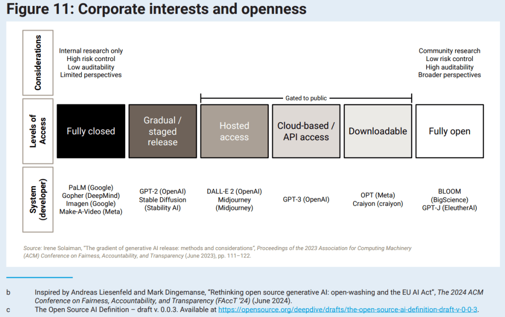 Una sección del informe de Naciones Unidas Governing AI for Humanity explica claramente que significa un «IA abierta». Habitualmente cuando hablamos de modelos open-source o código abierto, nos referímos a «modelos abiertos de pesos abiertos». Tenemos acceso al modelo pero no al código fuente ni a los datos con los que se han entrenado el modelo.